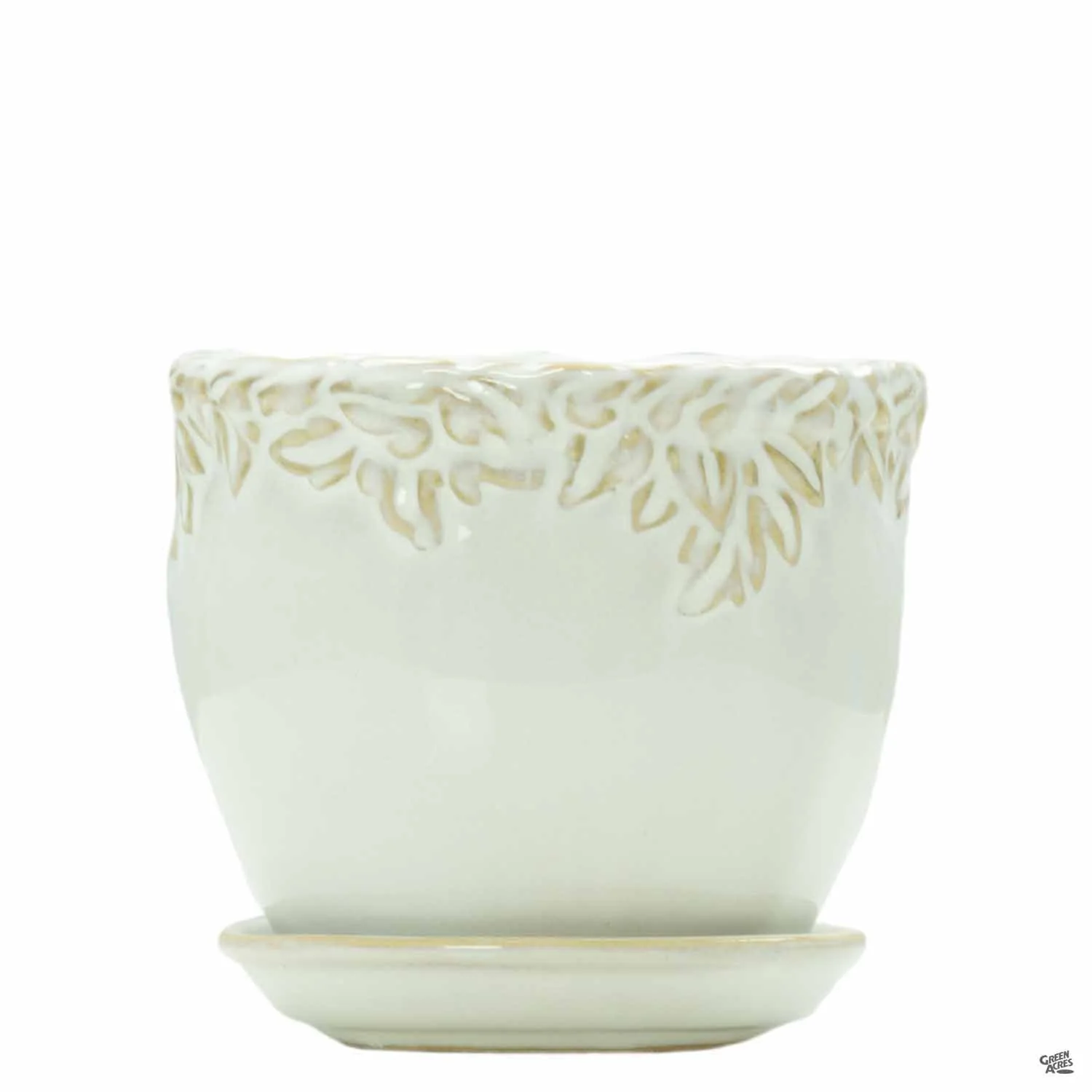 Ceramic pot with a neutral glaze and decorative rim serves as a perfect contrast for any houseplant foliage and flower. Available in multiple sizes. Pair with Ivy League Square & Window Box Ivy League planters. Plants sold separately.